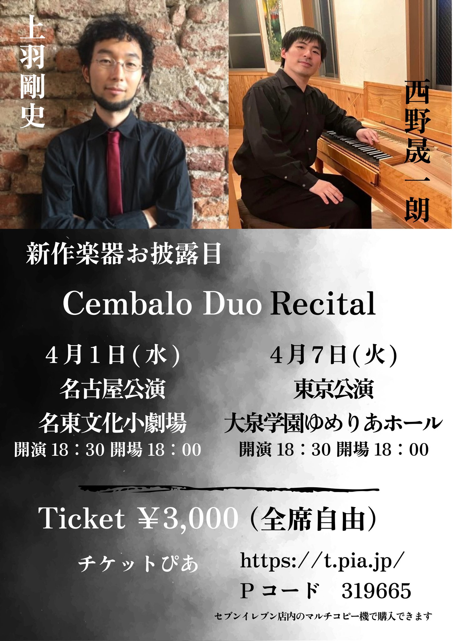 イベントNo: 401 ☆ 原クラヴィーア工房 新作お披露目Cembalo Duo Recital ☆ -- posted by 協会スタッフ 開催日時:2026/04/01(水) 18:30~ (開場:18:00 ~) 会場:名東文化小劇場 詳細: 名古屋公演 2026年4月1日18:30 名東文化小劇場 東京公演 2026年4月7日18:30 大泉学園ゆめりあホール 出演者: 上羽剛史(チェンバロ) 西野晟一郎(チェンバロ) 曲目: 未定 価格: 3,000円(全自由席) 問い合わせ:clavier.factory@gmail.com(原クラヴィーア工房) チラシ・画像: